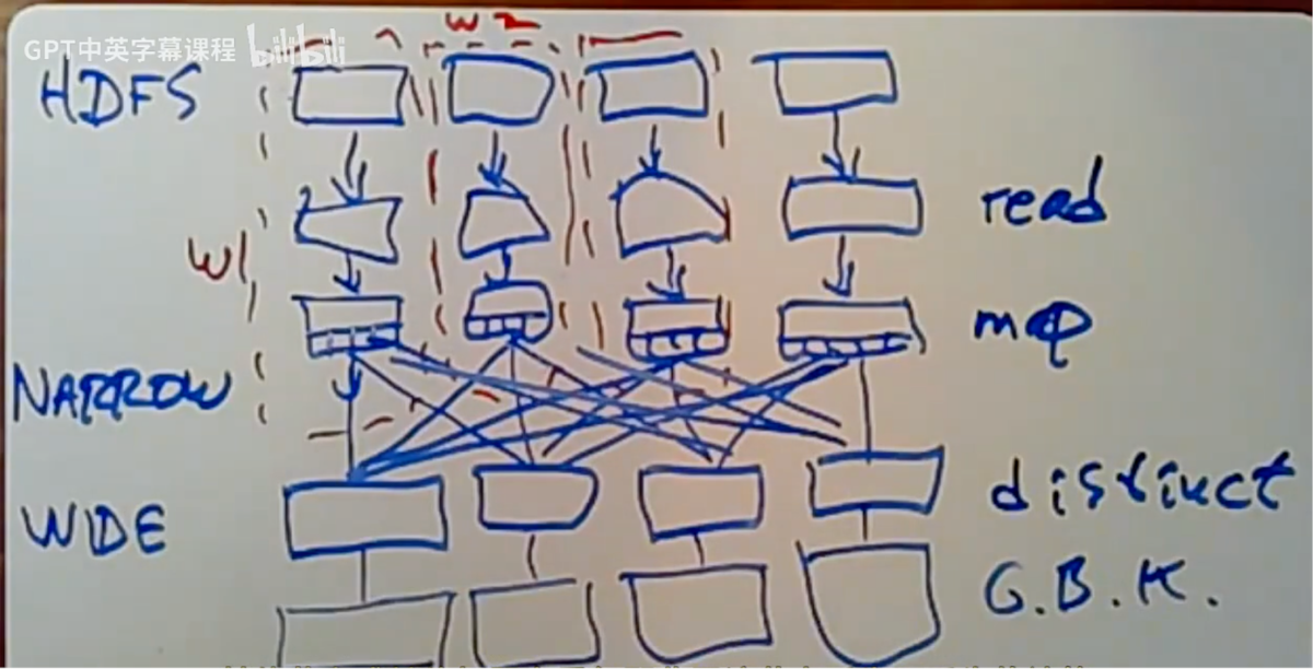 Spark在开始任何数据处理之前,会创建完整的血统图。之后下一步是映射阶段,其中每个工作节点应执行一个小函数,该函数将输入的每一行分割成一个from-to-link 链接元组。这是一种纯粹的本地操作,因此可以在同一个工作节点上进行。Spark并非先读取整个输入分区,再对其执行映射操作,而是读取第一条记录,或者可能只是最初的几条记录,然后对每条记录进行映射处理。实际上,它会对每条记录尽可能多地应用转换操作,之后才继续从文件中读取下一部分内容。这样做的目的是为了避免存储整个输入文件,因为这些文件可能非常庞大。按记录逐条处理显然更力高效。这就是所说的“窄依赖”情况下的处理过程,即那些仅考虑每个数据记录独立处理,无需担心与其他记录关系的转换操作。