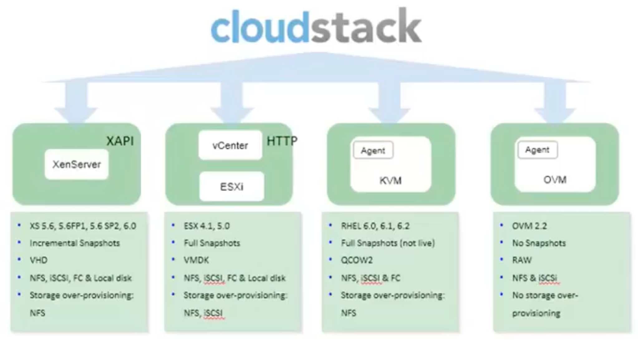 CloudStack 与各种虚拟机管理程序和类似虚拟机管理程序的技术配合使用。单个云可以支持包含多个虚拟机管理程序。支持类型有: